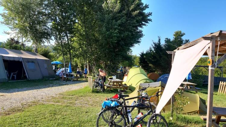 The campsite welcomes bikes, motorbikes and hikers who wish to stay for one or more nights in a tent. A dedicated area has been created for these campers, with direct access to the banks of the Rhône, tables and benches accessible to all, a shaded area, and a 50 m² hard-shell tent for rainy weather, equipped with a fridge, freezer and microwave.